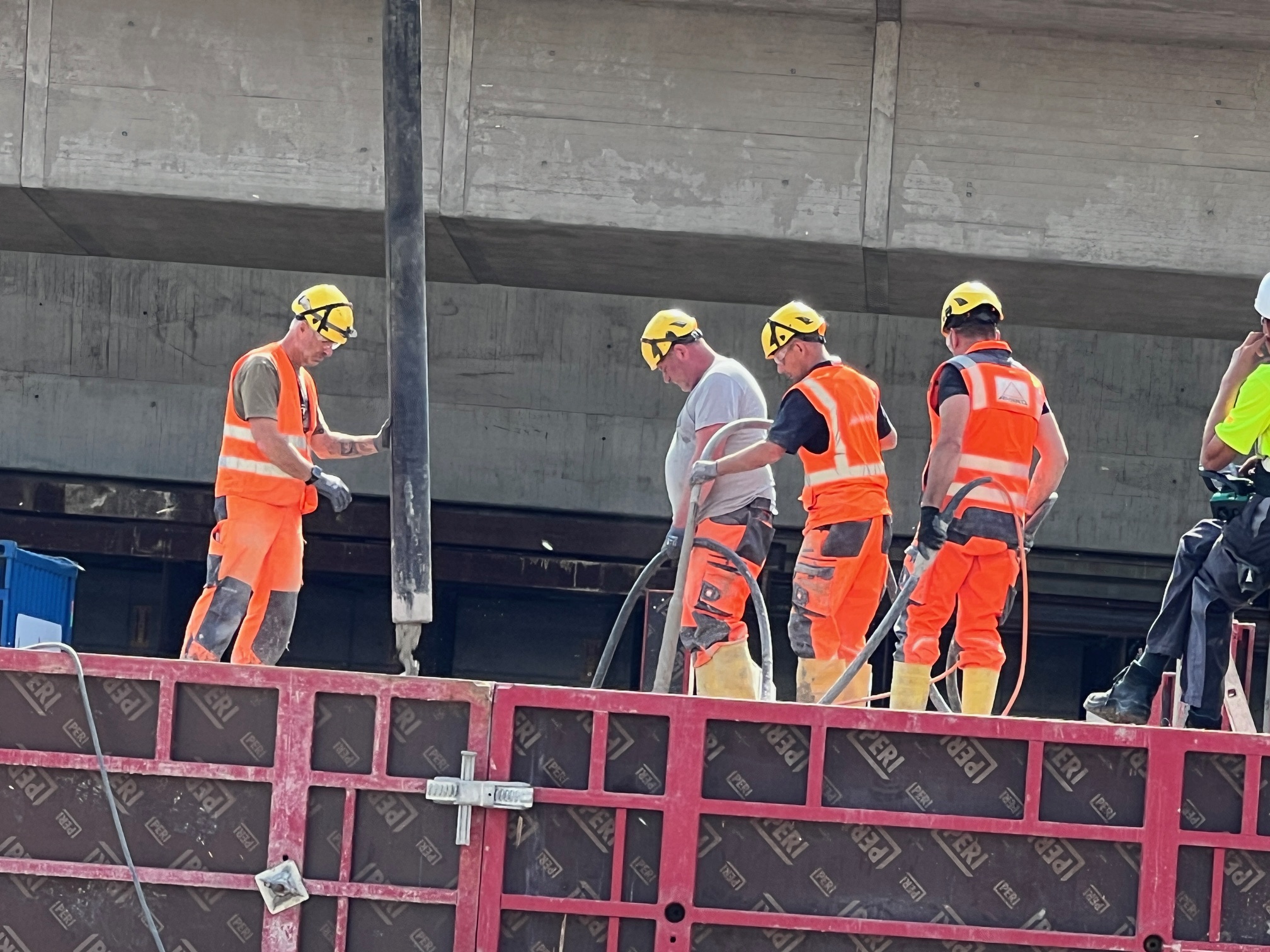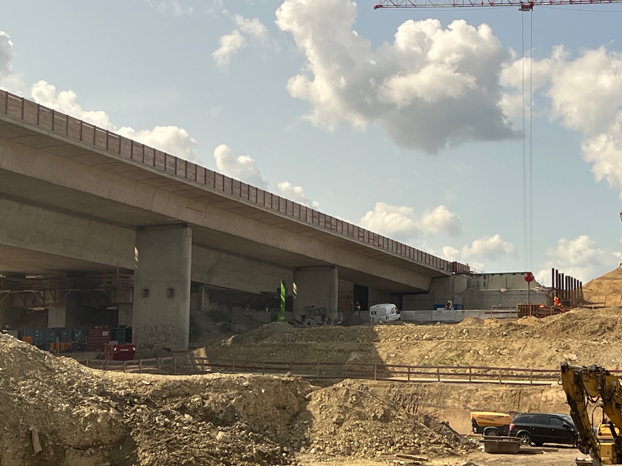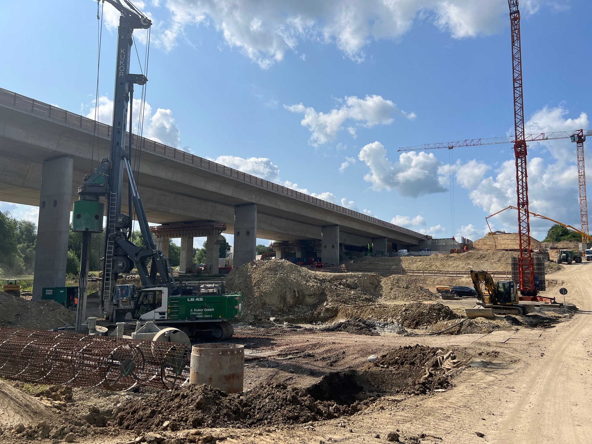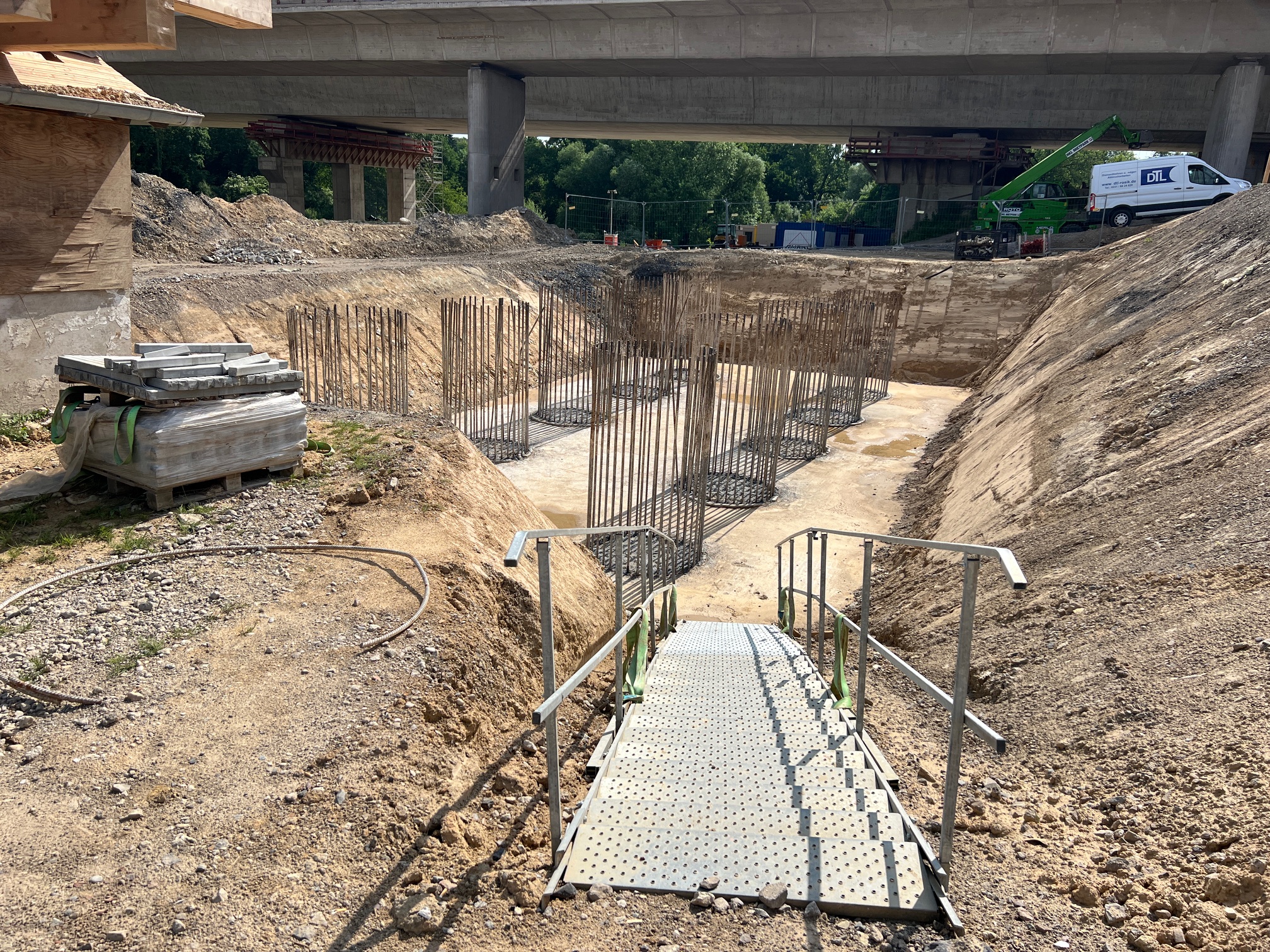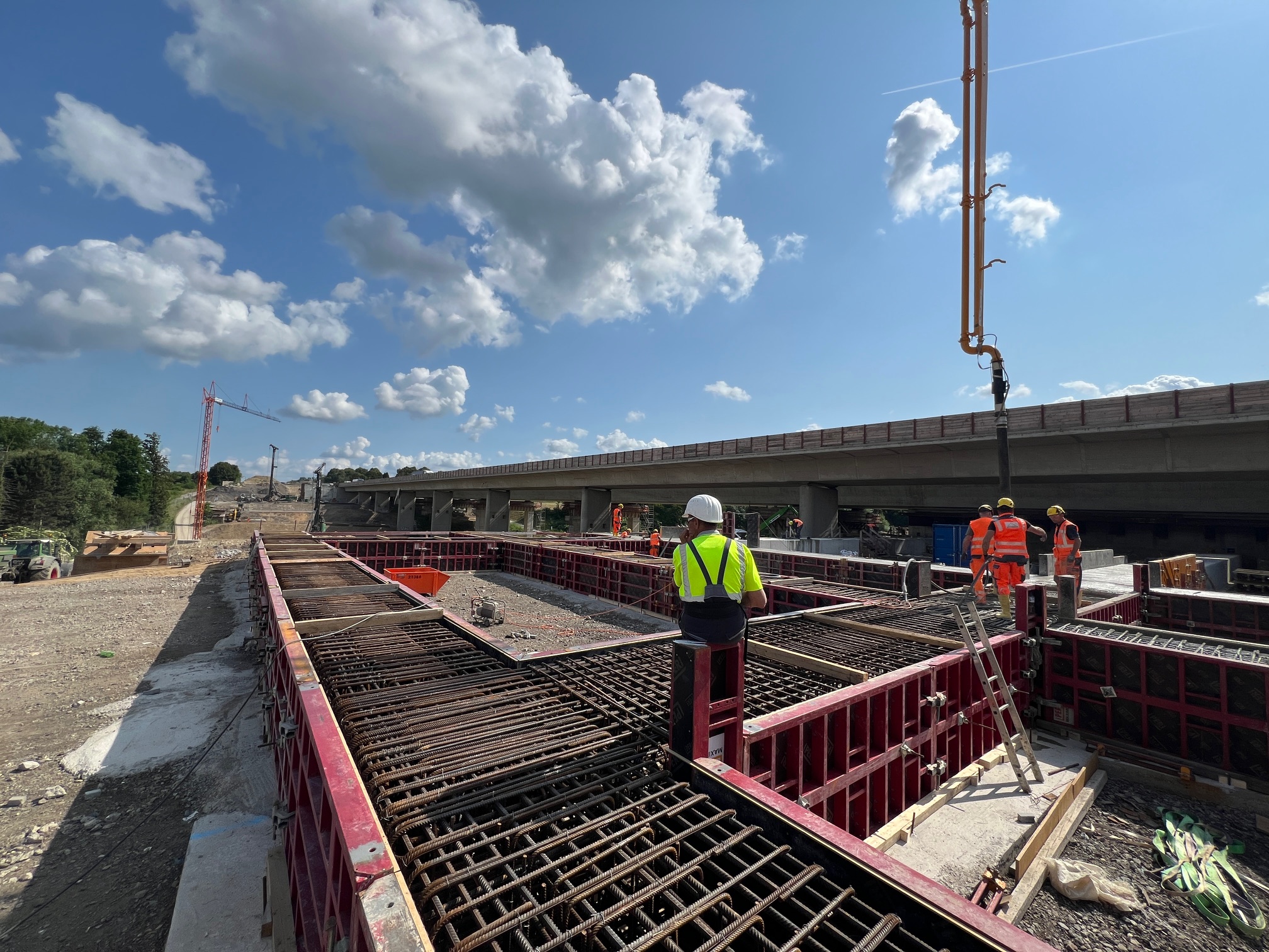 Südlich des Autobahnkreuzes Dortmund/Unna entsteht auf der A1 die neue, rund 300 Meter lange Liedbachtalbrücke. Der Ersatzneubau erfolgt in vier Bauphasen bei laufendem Verkehr und umfasst zwei Teilbauwerke. Zunächst wurde das östliche Teilbauwerk auf provisorischen Pfeilern errichtet – ohne Auswirkungen auf den Verkehr. Im Herbst 2024 wurde der Verkehr dorthin verlegt, sodass die alte Brücke schrittweise abgebrochen werden konnte. Nach der Sprengung des letzten Teilbauwerks im Januar 2025 beginnt der Neubau des westlichen Brückenteils für die Fahrtrichtung Köln. Besonderheit: Der Überbau wird im Taktschiebeverfahren mit 22 Takten errichtet – jeweils zwei Betonagen à 400 Kubikmeter pro Takt bei 60 Kubikmetern Stundenleistung. Insgesamt kommen etwa 40.000 Kubikmeter Beton zum Einsatz, davon rund 16.000 Kubikmeter im Überbau.